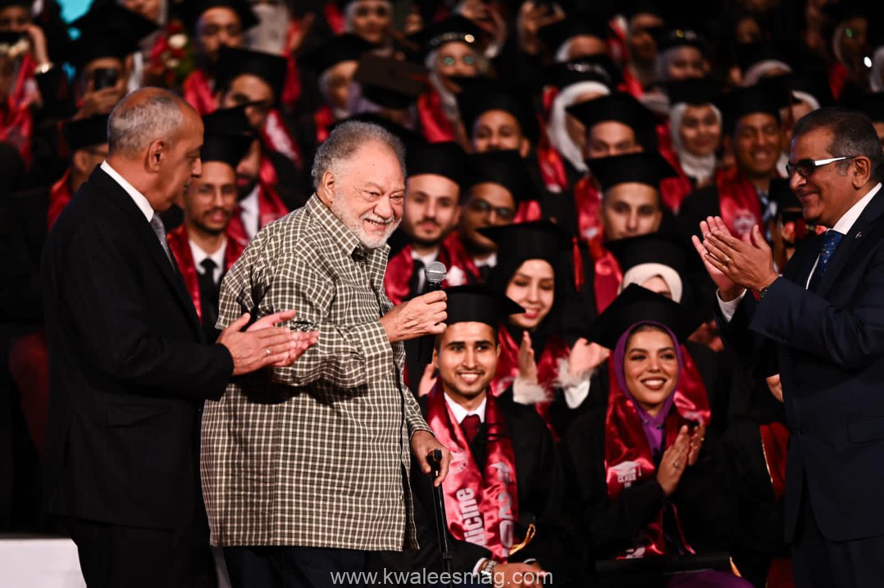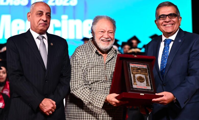 تكريم يحيي الفخراني بجامعة مصر للعلوم والتكنولوجيا في الاحتفال بتخريج دفعة جديدة من كلية “الطب البشرى”