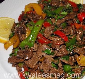 يتم تقطيع كل من قرون الفلفل الحمراء والخضراء، ثم يتم إضافتهم إلى الكبدة فى اللحظات الاخيره من التسويه حتى لايتغير لونهم ويحتفظوا بالقرمشه