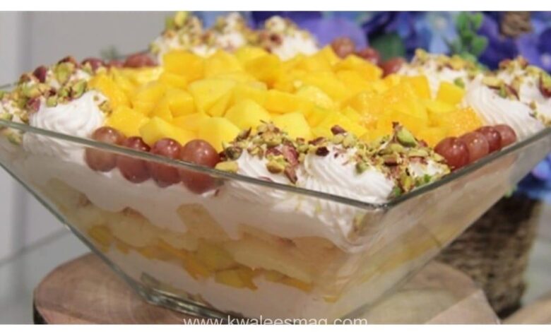 * توضع طبقة من مكعبات الكيك ثم طبقة من الكريمة المخفوقة ثم طبقة من المانجو ثم طبقة من الكاسترد وتكرر الطبقات مرة أخرى