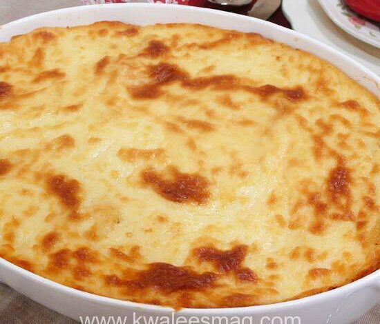 وأخيرا على الوجه نضع بيضة مخفوقه وقطع زبده وتوضع الصينية في الفرن لمدة 20 دقيقة، أو حتى يحمر السطح، ثم تترك لتبرد قليلا قبل التقطيع وتقدم.