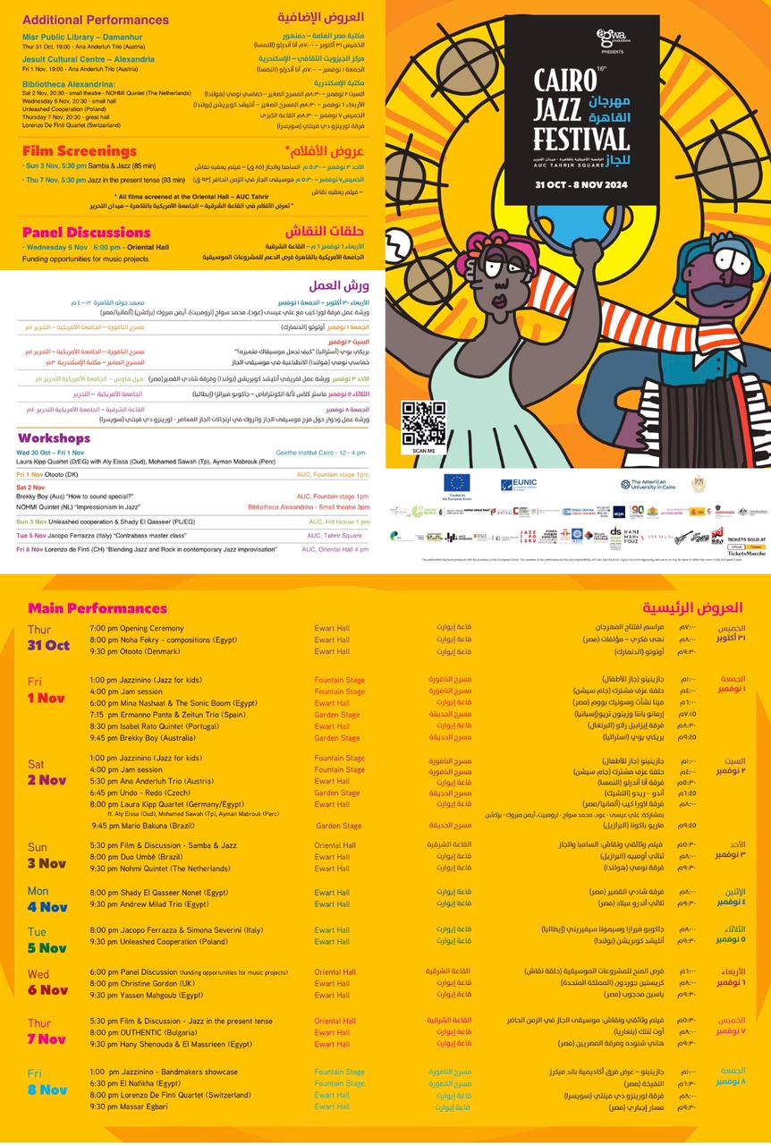 تنطلق فعاليات النسخة السادسة عشر من مهرجان القاهرة الدولي لموسيقى الجاز مساء الخميس 31 أكتوبر، في الجامعة الأمريكية بالقاهرة بميدان التحرير وتستمر حتى الجمعة 8 نوفمبر.